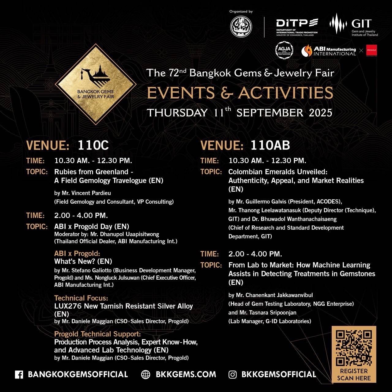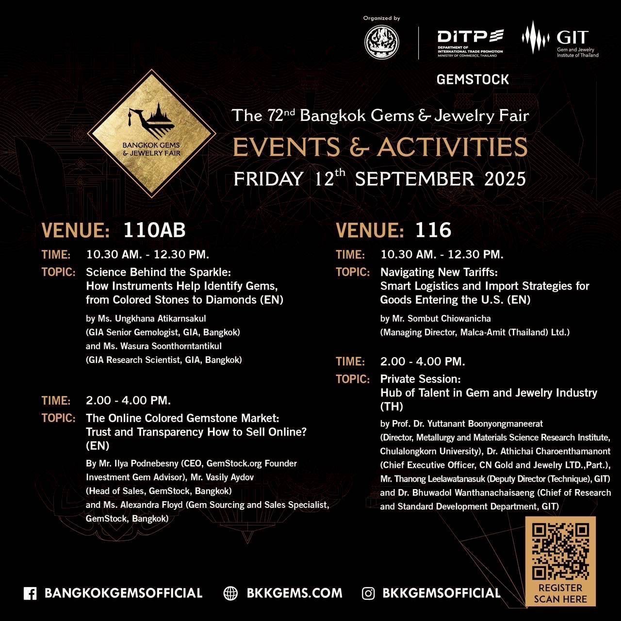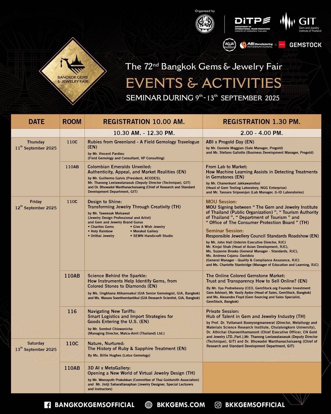ภายในงานสัมมนาได้มีการเชิญกูรูในวงการอุตสาสหกรรม “อัญมณีและเครื่องประดับ” ระดับประเทศเป็นวิทยากรให้ความรู้แก่ผู้ประกอบการเพื่อแลกเปลี่ยนองค์ความรู้และเป็นพื้นที่สำหรับผู้ประกอบการอัญมณีและเครื่องประดับได้ร่วมกันแสดงความคิดเห็น ระดมสมองหากลยุทธ์วิธีการ และแนวทางเพื่อเพิ่มขีดความสามารถในการแข่งขัน พร้อมผลักดันให้ธุรกิจอัญมณีและเครื่องประดับเติบโตอย่างมั่นคงและยั่งยืนในอนาคต