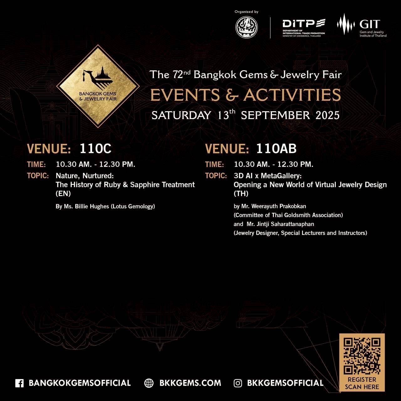 สถาบันวิจัยและพัฒนาอัญมณีและเครื่องประดับแห่งชาติ (องค์การมหาชน) กล่าวว่า GIT ในฐานะเป็นหนึ่งในผู้ร่วมจัดงานแสดงสินค้า Bangkok Gems & Jewelry Fair ครั้งที่ 72 เตรียมจัดสัมมนาให้ความรู้ด้านอัญมณีศาสตร์ การตลาด การออกแบบ มาตรฐานและกฎระเบียบการค้า งานวิจัยต่าง ๆ