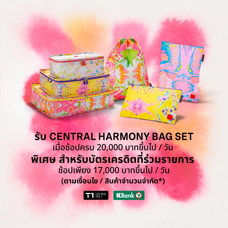 · แลกรับ เซ็ตกระเป๋า Central Harmony Bag set จำนวน 1 เซ็ต เมื่อช้อปครบ 20,000 บาทขึ้นไปต่อวัน พิเศษ! สำหรับผู้ถือบัตรเครดิต เซ็นทรัล เดอะวัน และบัตรเครดิตกสิกรไทย ช้อปครบ 17,000 บาทขึ้นไปต่อวัน (จำนวนจำกัด)