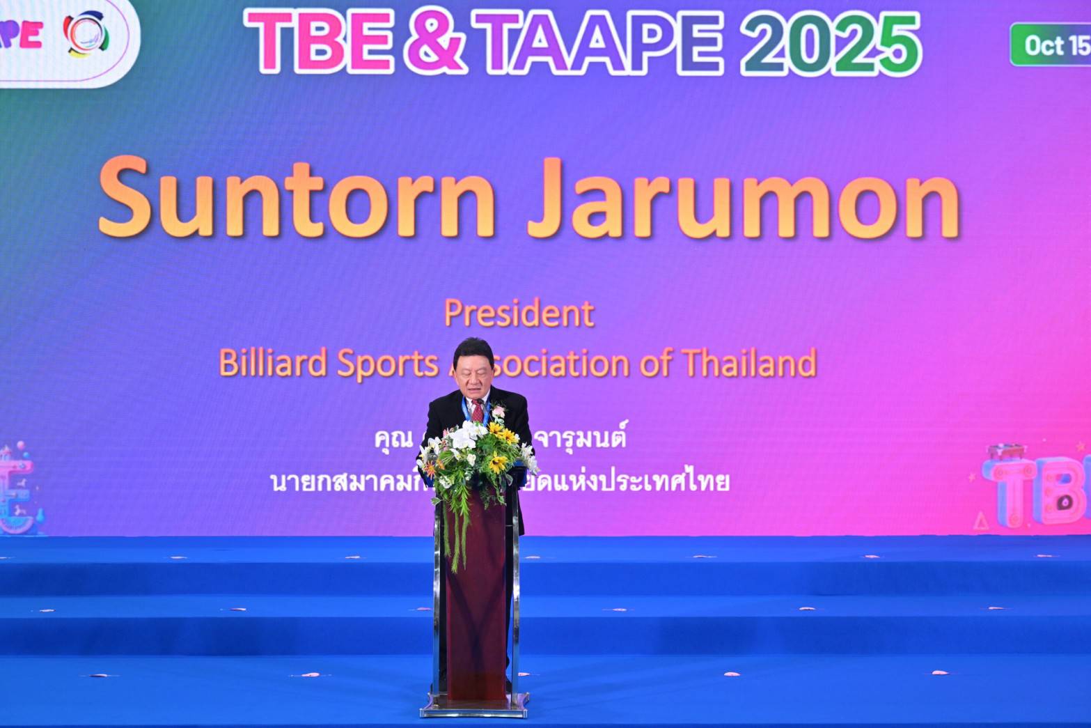 นายสุนทร จารุมนต์ นายกสมาคมกีฬาบิลเลียดแห่งประเทศไทย (BSAT) กล่าวถึงความร่วมมือระหว่างภาคธุรกิจท่องเที่ยวและกีฬาของประเทศไทยและจีน ในการจัดงาน Thailand Amusement & Attraction Parks Expo (TAAPE) 2025 และงาน Thailand Billiards Expo (TBE) 2025 ซึ่งจัดขึ้นครั้งแรกในประเทศไทย