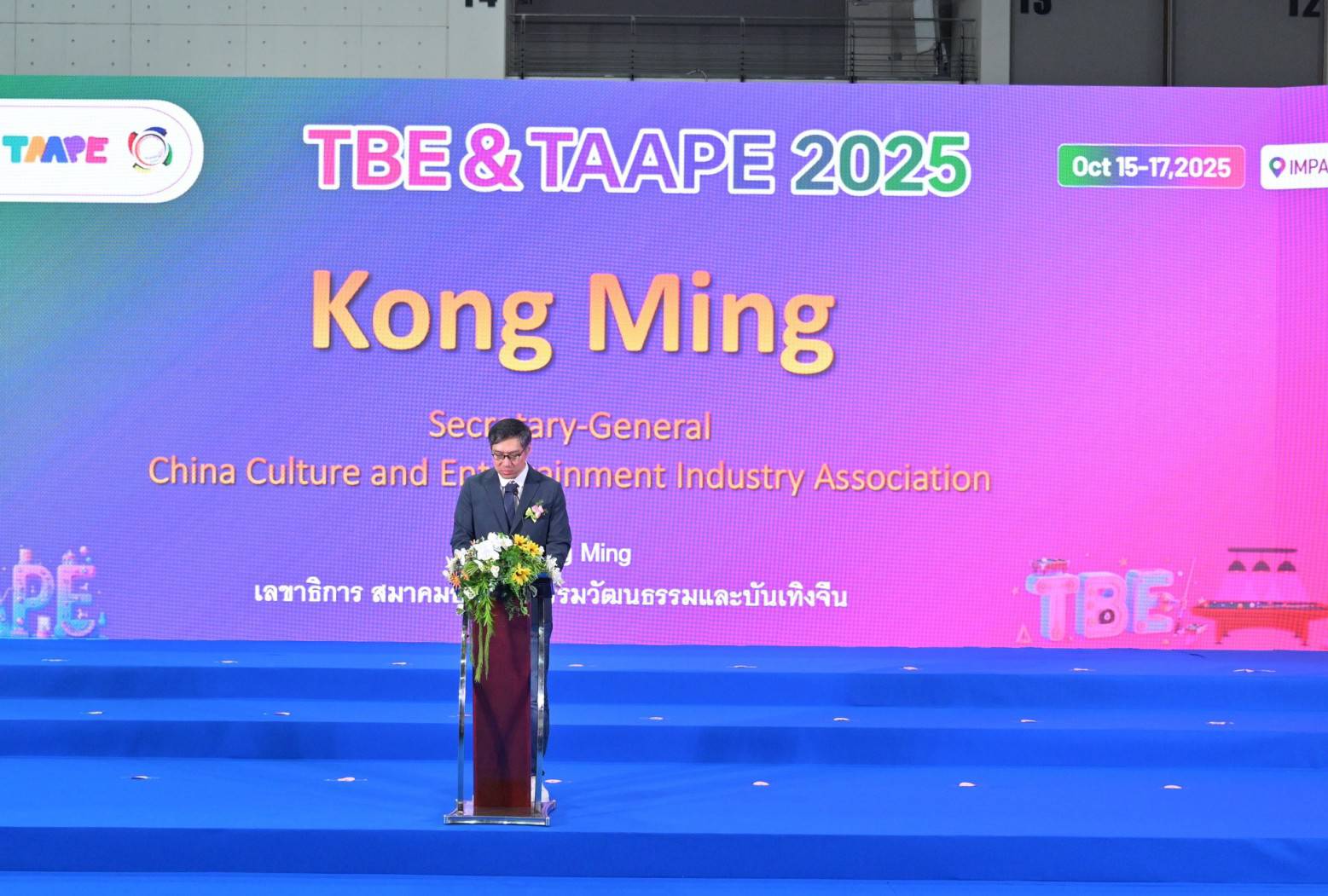 นายคง หมิง เลขาธิการสมาคมอุตสาหกรรมวัฒนธรรมและบันเทิงแห่งประเทศจีน กล่าวเสริมถึงการสนับสนุนการจัดงาน TAAPE และ TBE ถือเป็นหนึ่งในโครงการสำคัญภายใต้ “แผนปฏิบัติการ Thousands of Sails Go to Sea Action Plan และยังเป็นหมุดหมายสำคัญของการพัฒนาอุตสาหกรรมวัฒนธรรมและการท่องเที่ยวจีน–ไทย