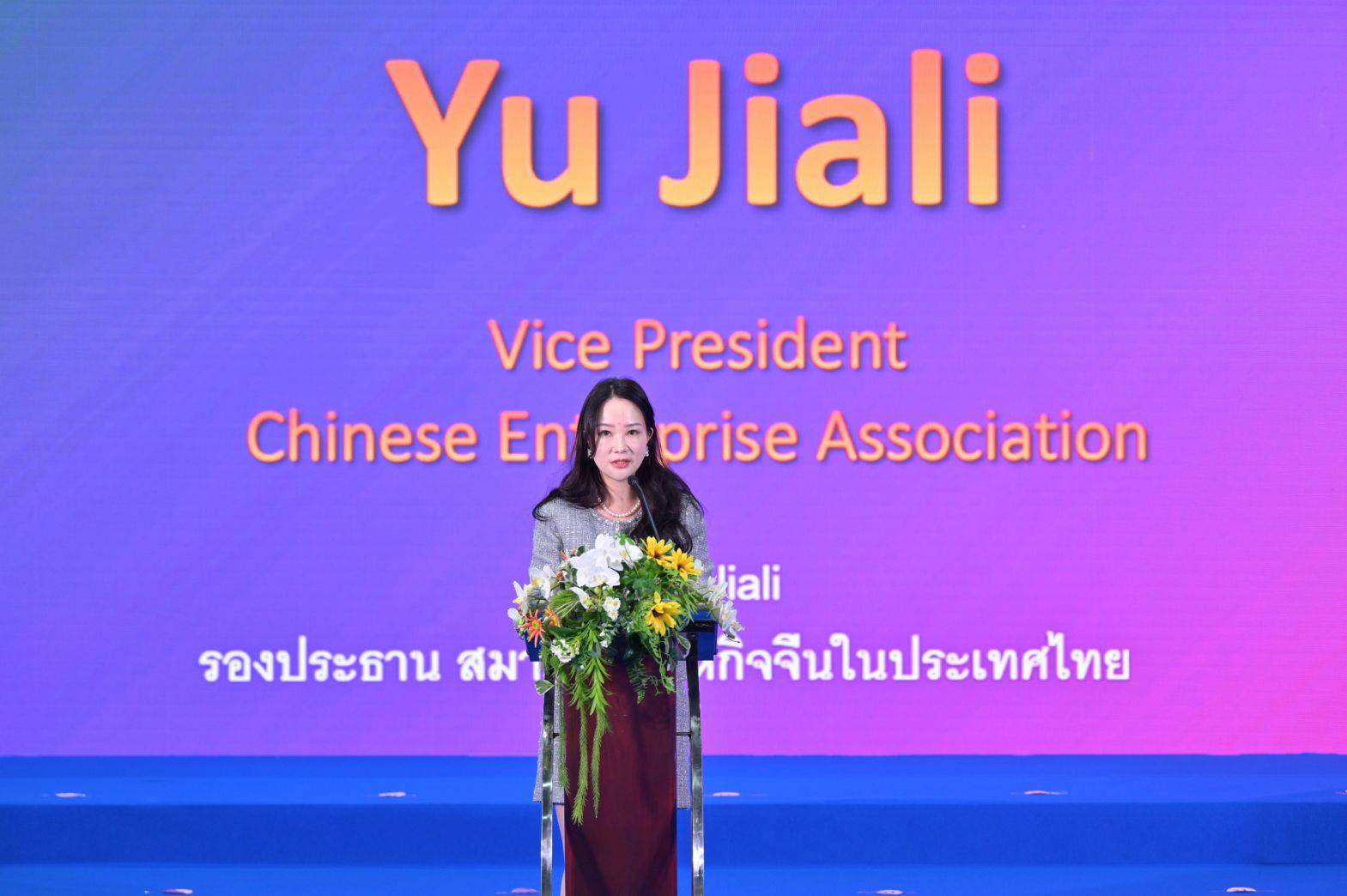 นางสาวยู เจียหลี่ รองประธานสมาคมวิสาหกิจจีนในประเทศไทย กล่าวถึงบทบาทของสมาคมฯ ได้ร่วมช่วยเหลือผู้ประกอบการจีนในประเทศไทยในการรับมือกับสภาวะเศรษฐกิจที่ซับซ้อนและเปลี่ยนแปลงอย่างรวดเร็ว พร้อมทั้งสนับสนุนให้ธุรกิจเหล่านี้ปรับตัวเข้าสู่สังคมไทยอย่างราบรื่น ผ่านการดำเนินงานใน 4 ด้านหลัก ได้แก่ ความร่วมมือทางการค้า การบูรณาการด้านข้อมูลข่าวสาร การแลกเปลี่ยนทางวัฒนธรรม และความรับผิดชอบต่อสังคม เพื่อให้เกิดการพัฒนาอย่างมั่นคงและยั่งยืน