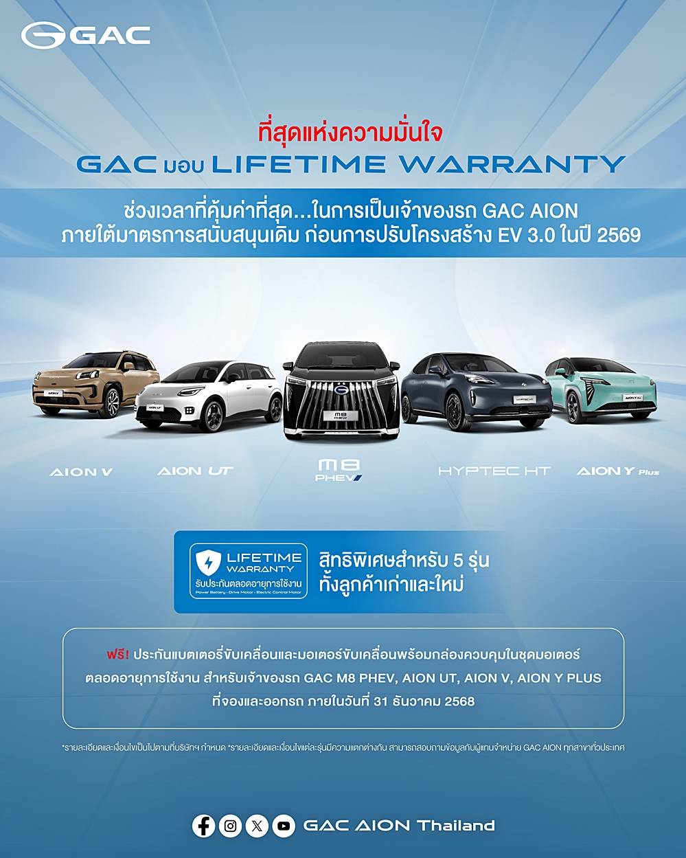GAC AION Thailand ประกาศมอบสิทธิ์ “Lifetime Warranty” ให้กับรถยนต์ รุ่น GAC HYPTEC HT, GAC M8 PHEV, GAC AION V, GAC AION UT และ GAC AION Y Plus เพื่อขอบคุณทุกความไว้วางใจและสร้างความเชื่อมั่นสูงสุดแก่ลูกค้าชาวไทย เพื่อเป็นการตอบแทนความไว้วางใจที่ลูกค้าชาวไทยมอบให้เสมอมา