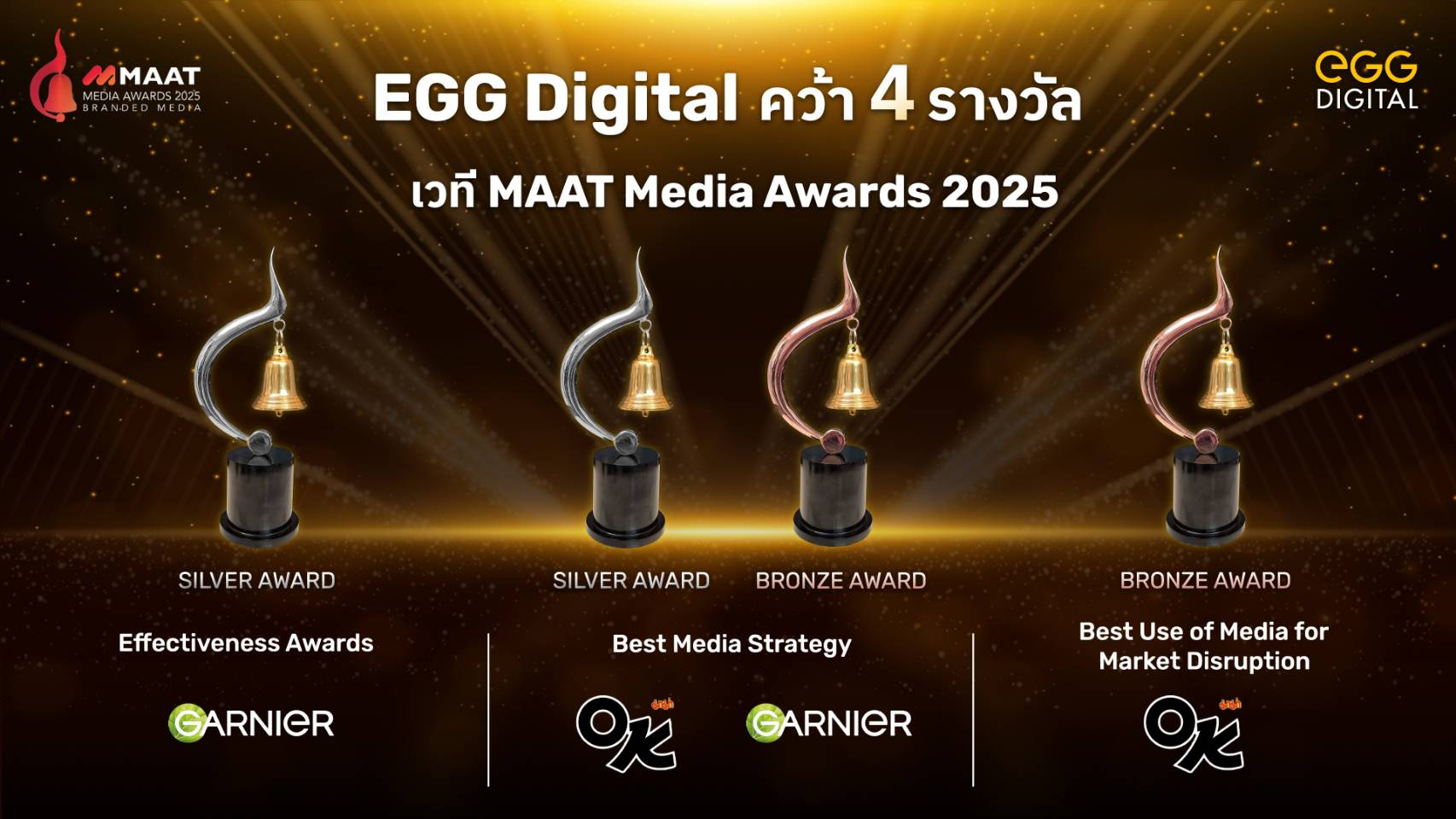 เอ้ก ดิจิทัล (EGG Digital) ตอกย้ำศักยภาพในฐานะผู้ให้บริการสื่อโฆษณาครบวงจรแห่งยุคดิจิทัล คว้า 4 รางวัลจากเวทีสื่อโฆษณาระดับประเทศ “MAAT Media Awards 2025” ได้แก่ รางวัลระดับ Silver 2 รางวัล และ Bronze 2 รางวัล จากแคมเปญ MAMA OK และ Garnier (การ์นิเย่)