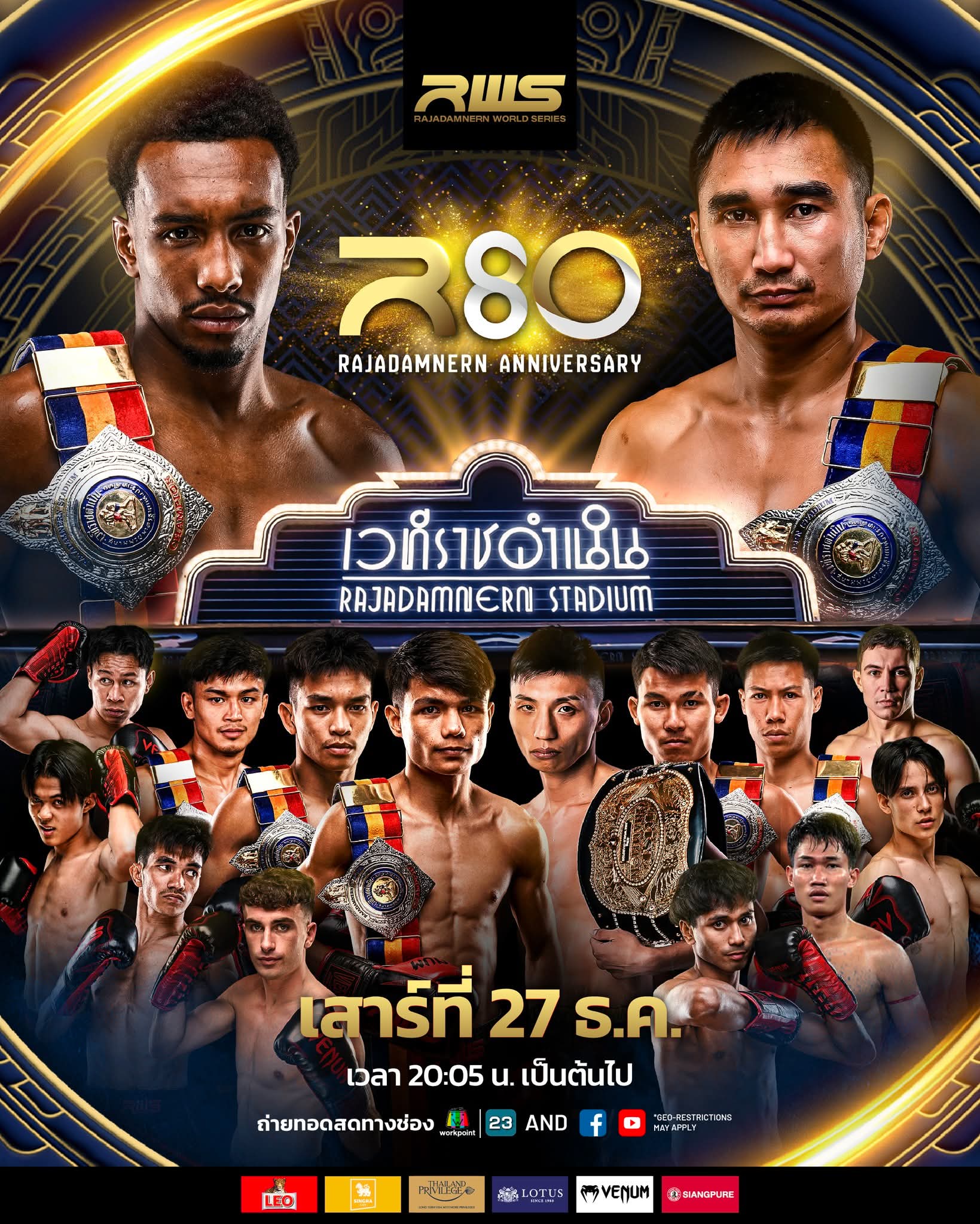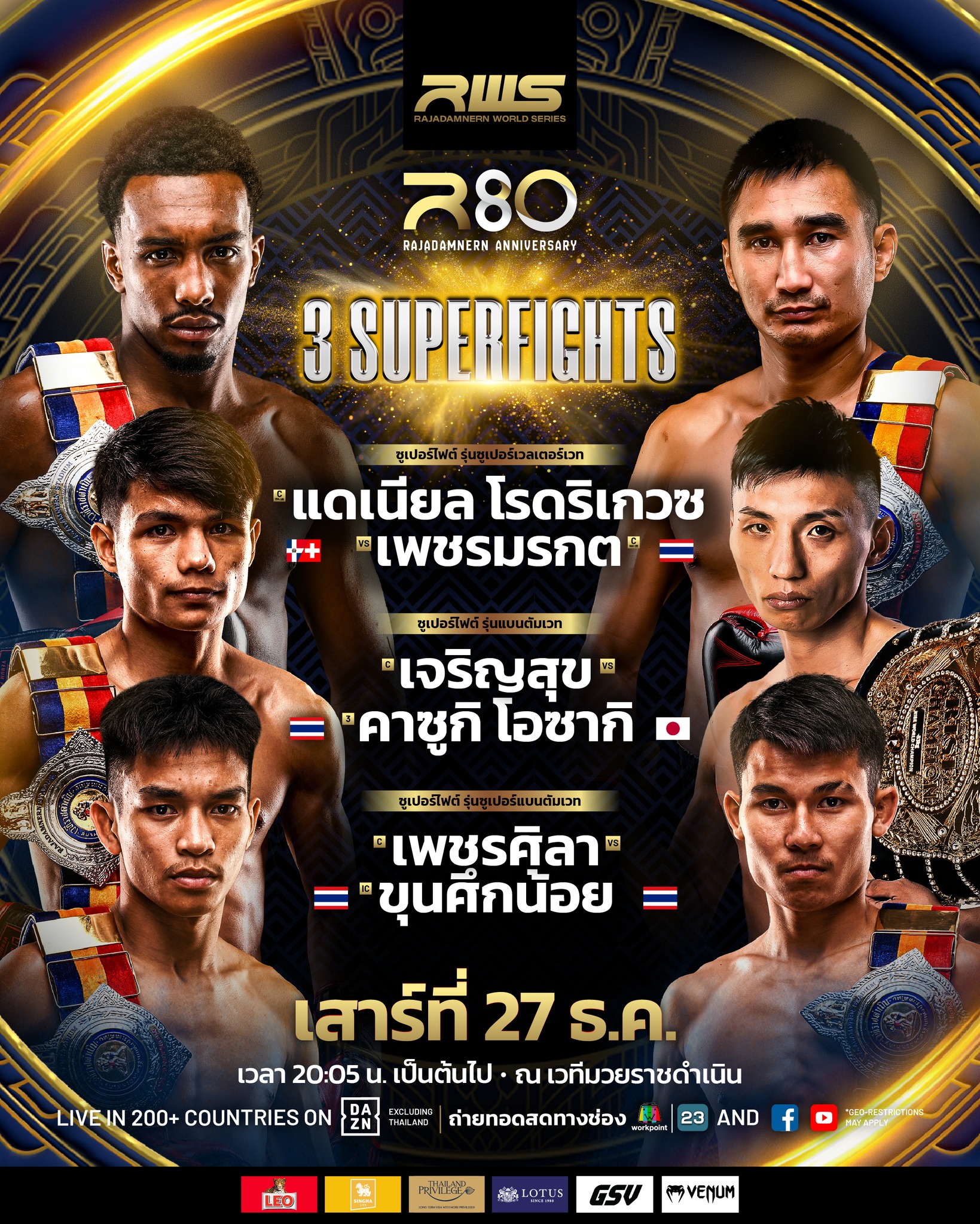 ปีนี้ศึก “R80 Rajadamnern Anniversary” เตรียมระเบิดความมันส์ในวันเสาร์ที่ 27 ธันวาคม 2568 กับการรวมสุดยอดคู่มวยที่ดีที่สุดของปีมาไว้ในค่ำคืนเดียว นำทัพโดย 3 คู่ซูเปอร์ไฟต์หยุดโลก คู่ชิงแชมป์ราชดำเนิน 1 คู่ และคู่ประกอบรายการอีก 4 คู่