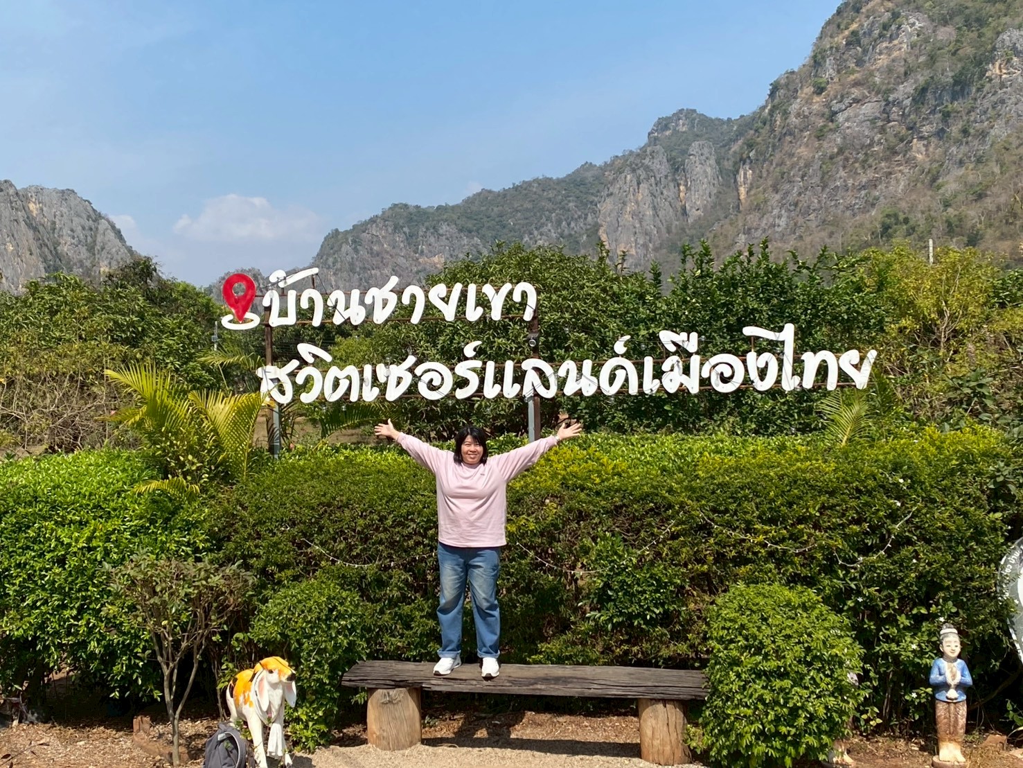 หลังจากนั้นก็ไปต่อด้วยการดื่มด่ำกับวิวหลักล้านที่ ”บ้านชายเขา” จุดเช็คอินที่ได้รับฉายาว่า สวิตเซอร์แลนด์เมืองไทย ด้วยภาพภูเขาหินปูนสูงตระหง่านสลับซับซ้อน โอบล้อมด้วยไร่สวนของชาวบ้าน เป็นจุดที่เหมาะสุดในการนั่งจิบเครื่องดื่มเย็นๆ แล้วปล่อยใจสนุกไปกับสายลม