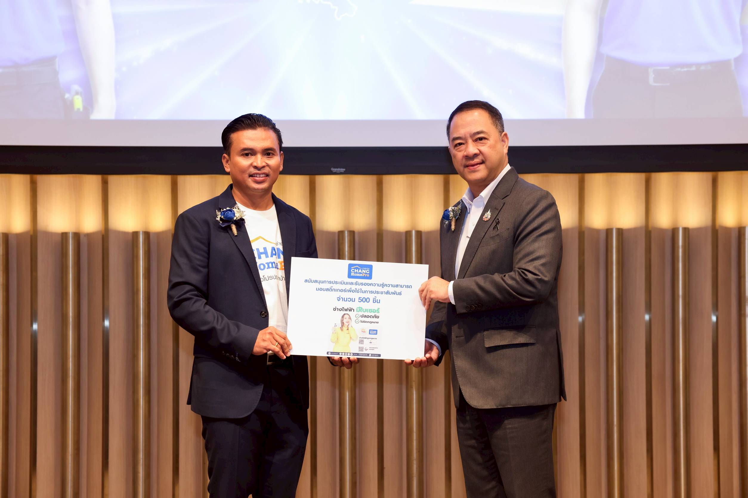 อีกหนึ่งไฮไลต์สำคัญของงาน คือการมอบ สติ๊กเกอร์สัญลักษณ์ “ช่างไฟฟ้ามีใบเซอร์” ให้แก่ทีมช่างที่ผ่านเกณฑ์มาตรฐานในสาขาช่างไฟฟ้าภายในอาคาร ซึ่งทำหน้าที่เป็นทั้งเครื่องหมายรับรองความสามารถ และสัญลักษณ์แห่งความมั่นใจที่ลูกค้าสามารถมองเห็นได้ทันที