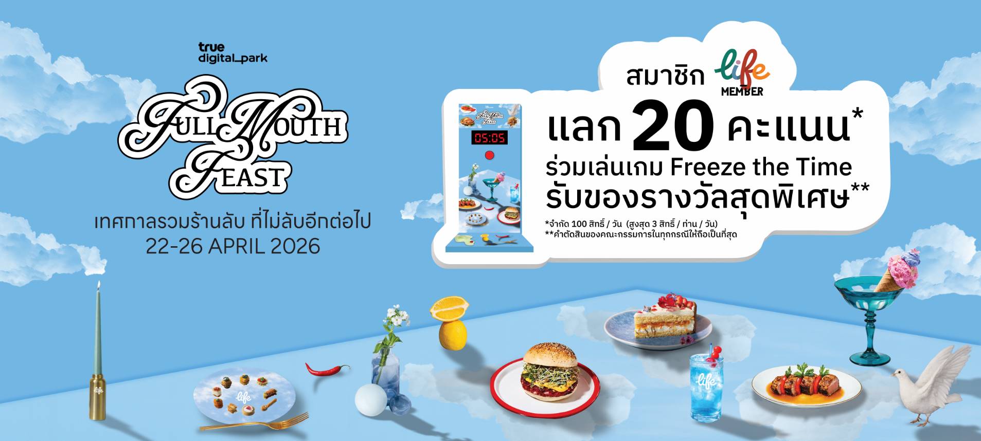พิเศษ! สมาชิก Life Member แลก 20 คะแนน ร่วมเล่นเกม Freeze the Time รับของรางวัลสุดพิเศษเฉพาะงานนี้เท่านั้น เพราะทุกคำที่ลิ้มลอง...คือช่วงเวลาแห่งความสุขที่แตกต่าง