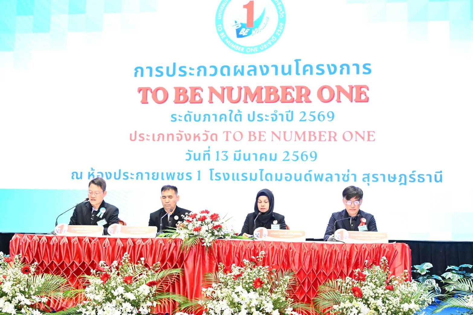 สำหรับการประกวดผลงานในวันนี้ เป็นการแสดงความสำเร็จของการดำเนินโครงการตามแนวพระดำริขององค์ประธาน ตั้งแต่ระดับจังหวัด อำเภอ ชุมชน และชมรมประเภทต่าง ๆ และยังเป็นเวทีการเรียนรู้ และแลกเปลี่ยนประสบการณ์การทำงานโครงการ TO BE NUMBER ONE ของเครือข่ายภาคใต้ ที่มีคุณค่าอย่างยิ่ง การดำเนินงานตามแนวทางโครงการ TO BE NUMBER ONE จังหวัดและอำเภอ